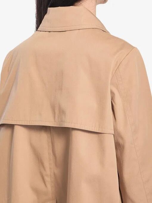 防水性のあるキャメルカラーのコットンギャバジン製ピーコート。