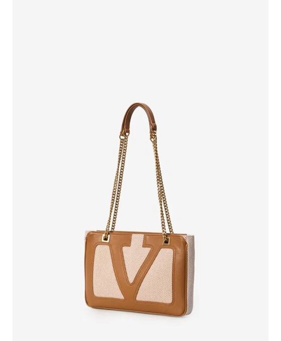 前面にブラウンレザーのマキシVロゴシグネチャー、レザーハンドル付きスライドチェーンストラップ、ジッパー付き外側フラットポケット、ジッパー開閉、内側コンパートメントが1つ付いています。