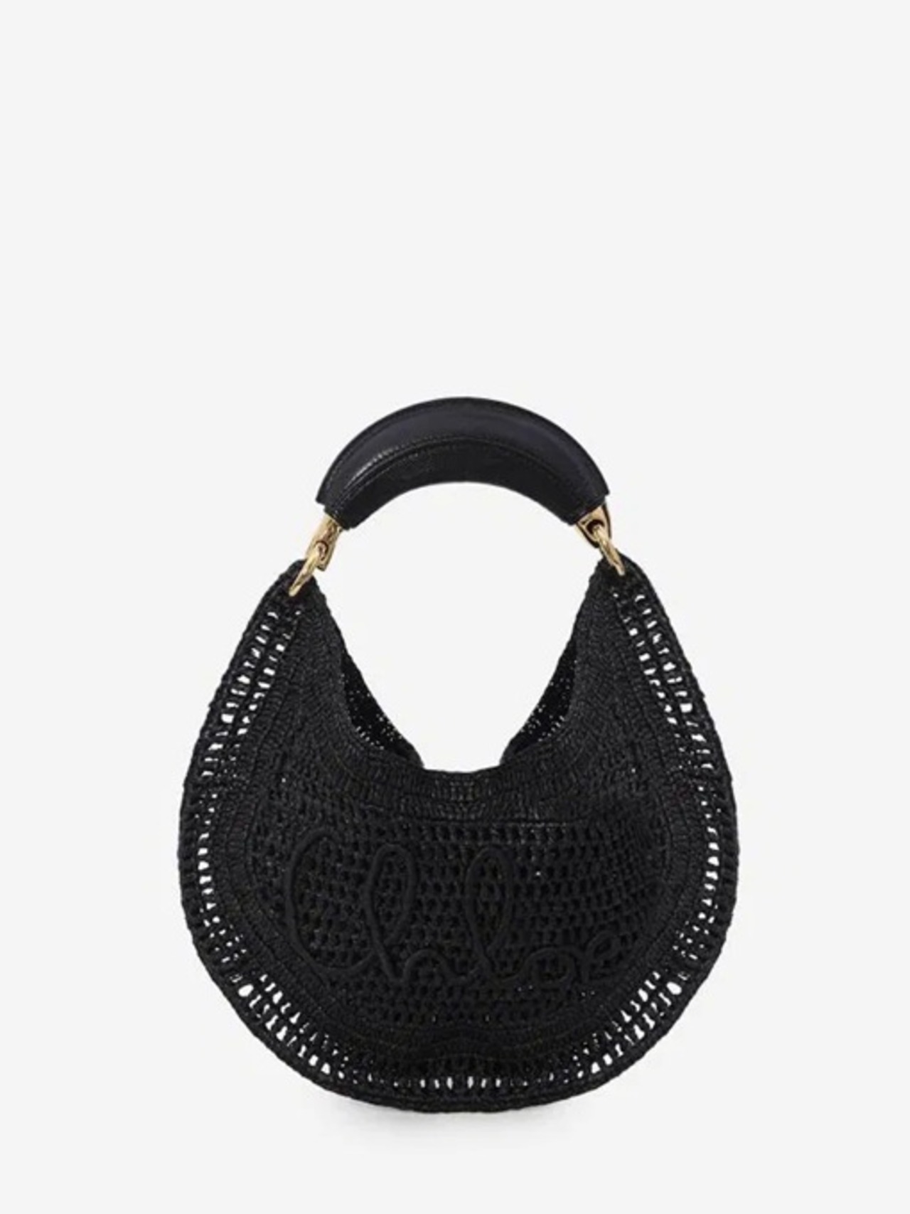 バナナの形をしたゴールドトーンのメタルトップハンドルが特徴で、ブラックレザーで覆われ、前面にクロエのロゴが筆記体で描かれ、トーンオントーンの織りのディテールが施されています。