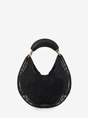 ラフィアのような織りの質感を持つセルロース紙を使用したサマーバナナ ホーボーバッグ。サマリーブラック。