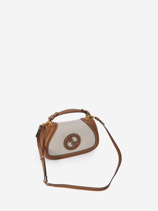 ブラウンのレザーとベージュのコットン生地を使用したミディアムサイズのグッチ ブロンディ バッグ。