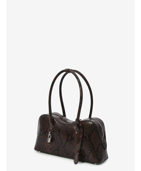 馬の姿を表現した彫刻的なシルエット、ロゴ刻印入りの南京錠、キャノピーライニング、トップハンドル2本、ダブルスライダージッパー開閉、メインコンパートメント1つ、内ポケット1つ(オープンポケット1つ、マグネット開閉式ポケット1つ)、メタル製の底が特徴です。