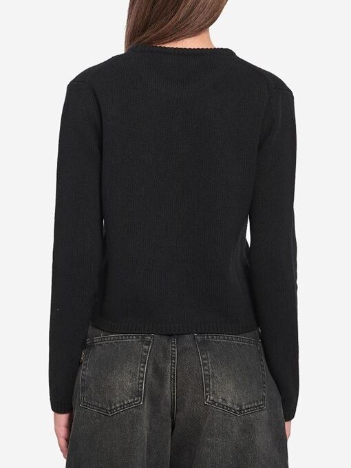 長袖、リブ編みのクルーネック、ホワイトのシェニール刺繍ロゴディテールが特徴です。