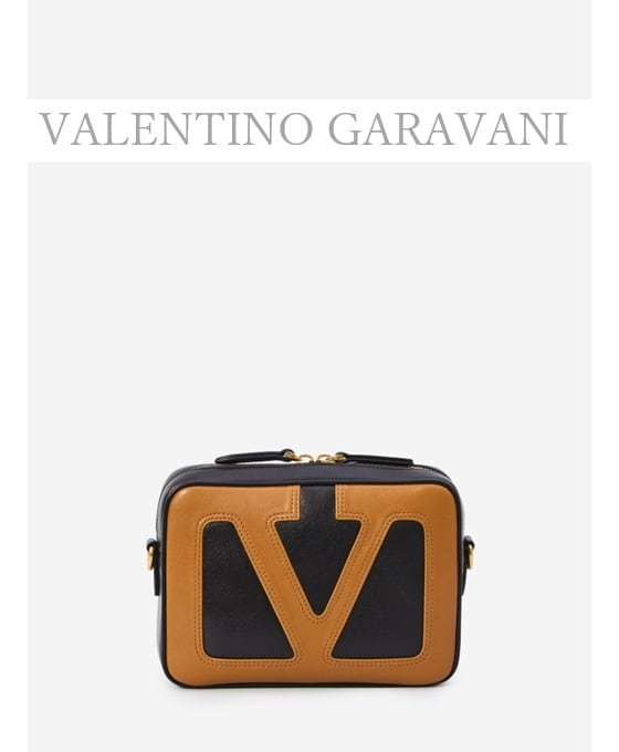 ブラウンのVロゴシグネチャーが入ったブラックのナッパレザーバッグ。