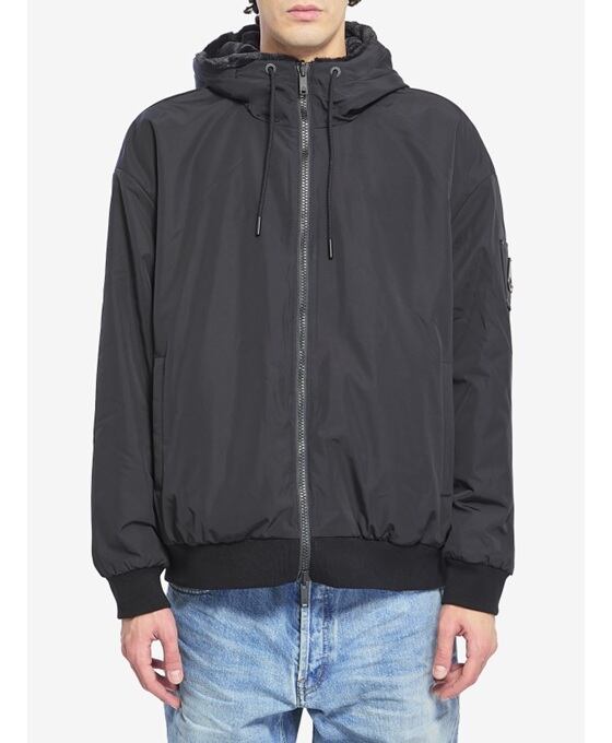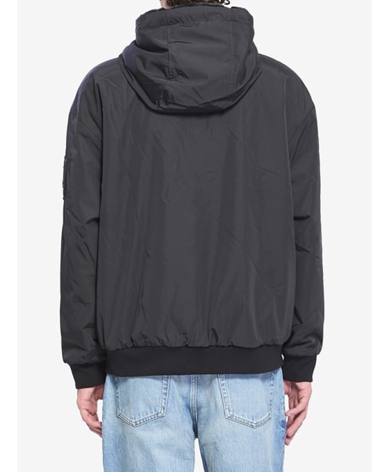 ドローストリングで調節可能なフード、フロントジップ開閉、片面にフロントポケット2つ、もう片面にジップポケット2つ、袖口にはメタルロゴ、もう片面にロゴパッチ、伸縮性のある裾と袖口が特徴です。
