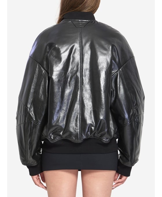 光沢のあるブラックのハンマードレザーを使用した中綿入りジャケット。