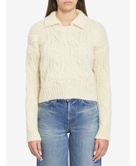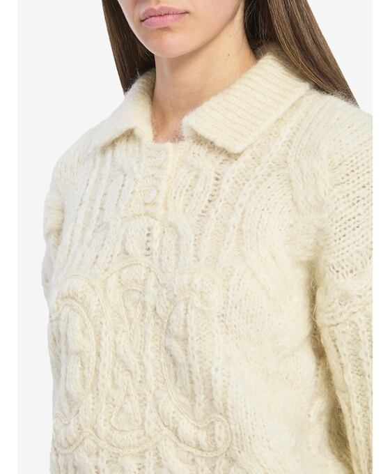 アイボリーのモヘア&ウールニットポロシャツ。