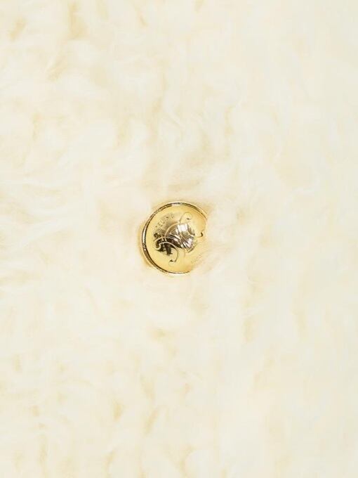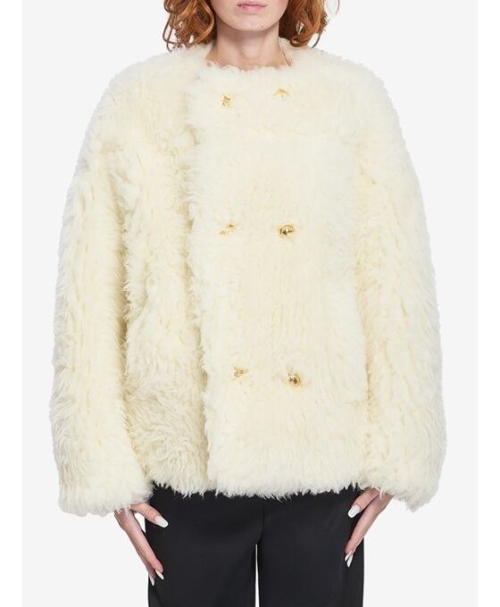 ホワイトチョークカラーのウール混フェイクファーコート。