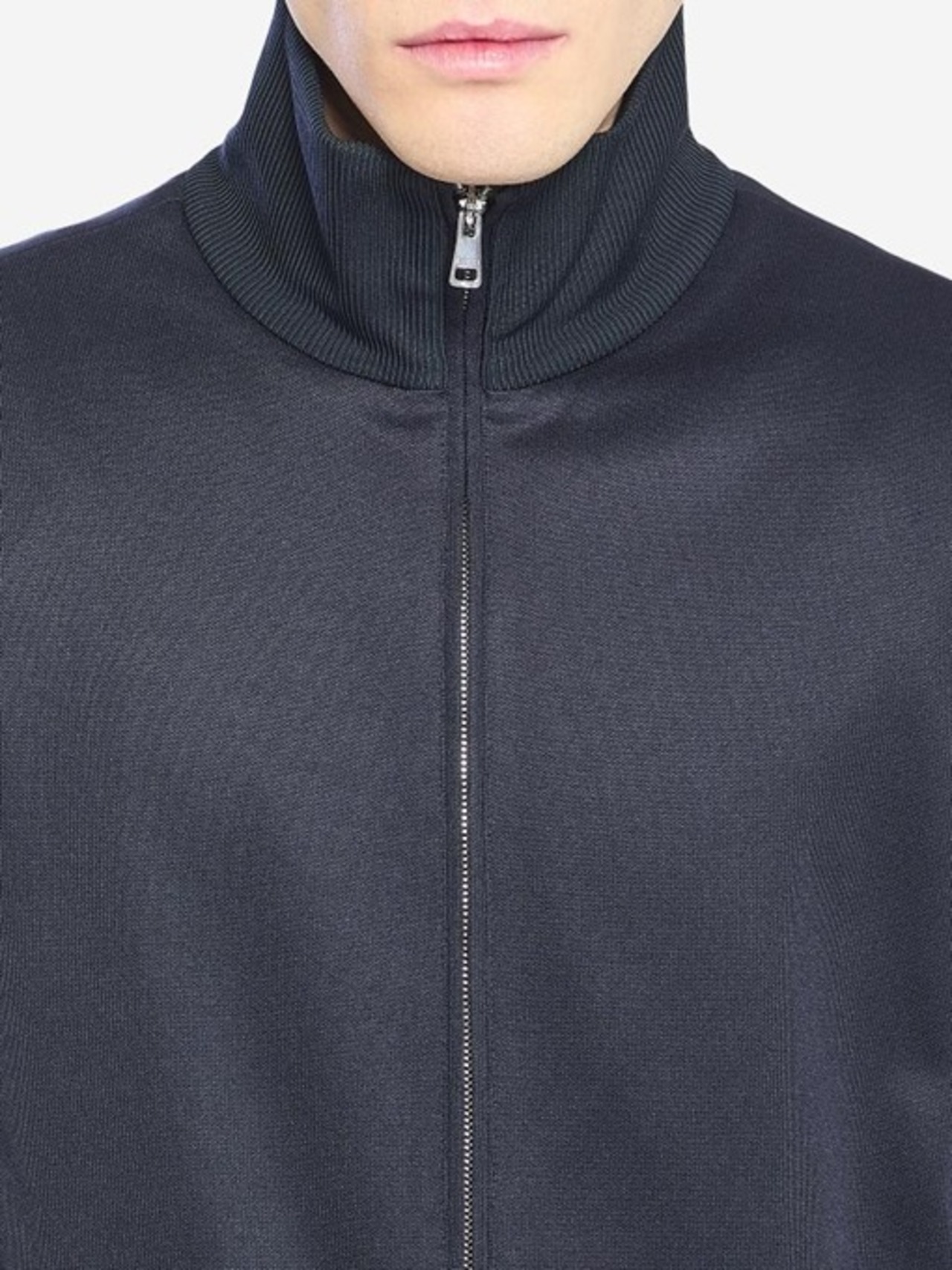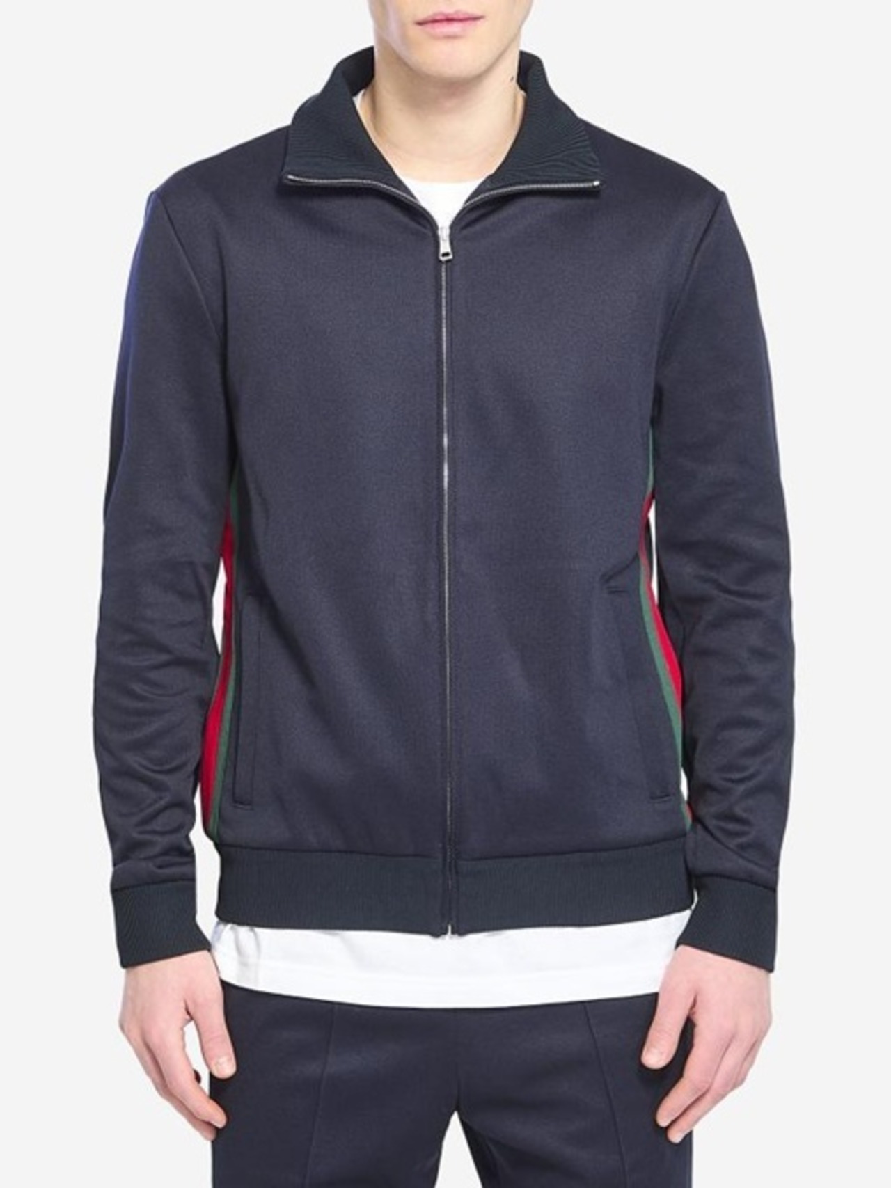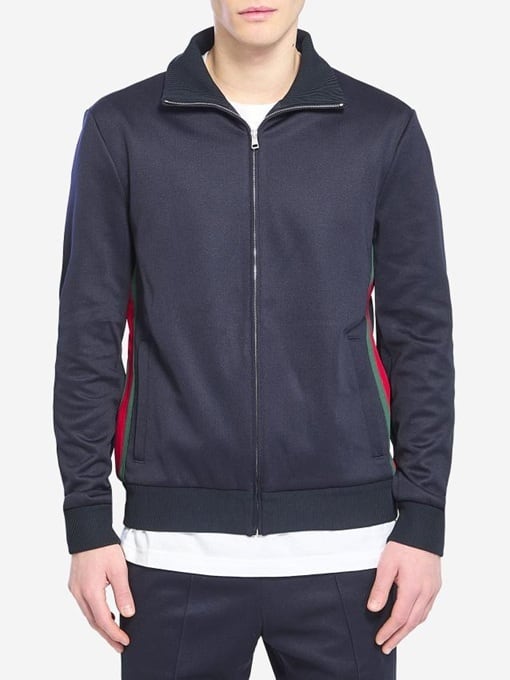 リブ編みのスタンドカラー、フロントジップクロージャー、サイドのウェブストライプ、フロントに2つのジップポケット、長袖、リブ編みの袖口と裾が特徴です。