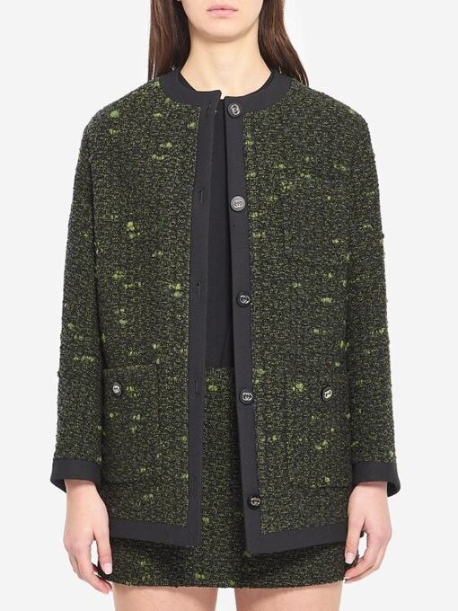 グリーンとブラックのブークレウールカーディガンジャケット。