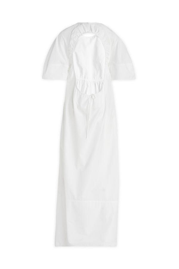 ドローストリング付きバックネックラインが特徴のコットン製ロングドレスです。