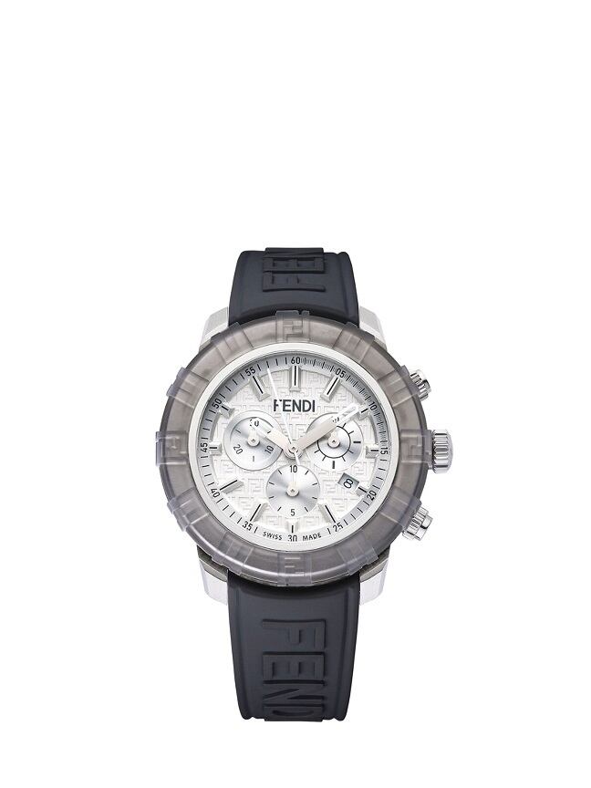 光沢のあるサテン仕上げのブラックとシルバーのステンレス スチール製の 45 mm ラウンド ケースと、透明なシリコン ベゼルを備えています。