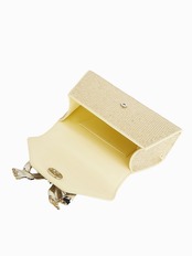 ラインストーンで覆われたゴールドトーンのシンセティック レザー製ボウ エンベロープ ミニ バッグです。