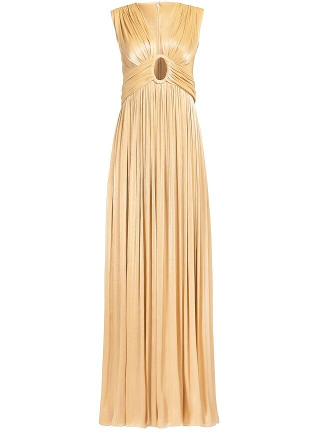 パウダーピンクの色合いのルレックスジョーゼットのプリーツを使用したキエラのロングドレスです。