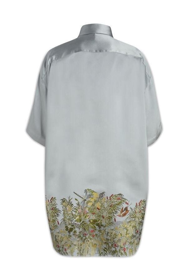 植物と花のモチーフをボトムにプリントしたビスコース素材のシャツです。