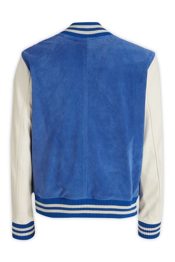 胸元のロゴパッチが特徴のスムースレザーとスエードを使用したボンバージャケットです。