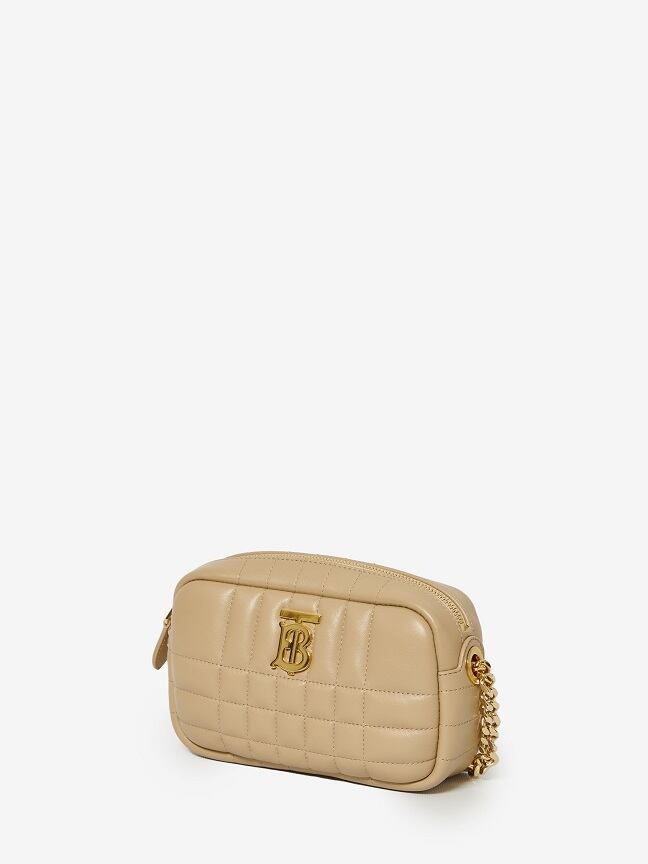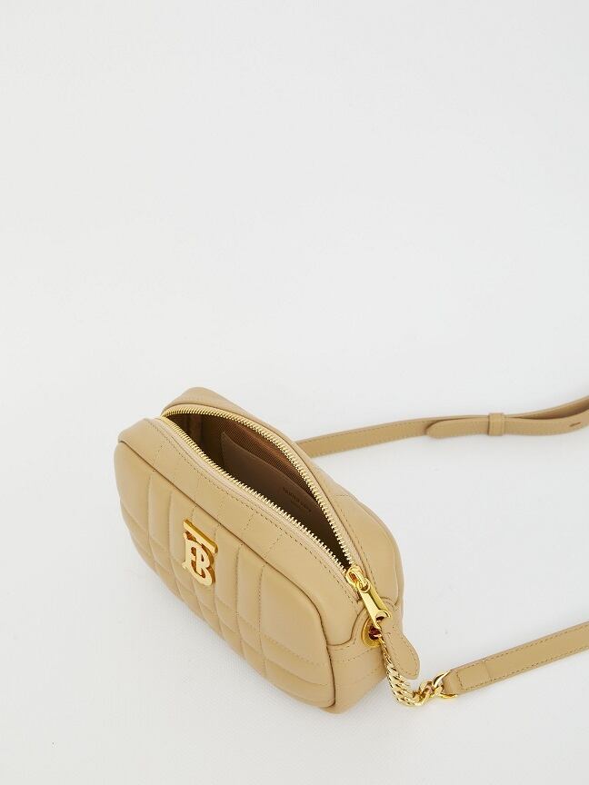 ベージュのキルティング ラムスキンのカメラ バッグ ローラ ミニです。