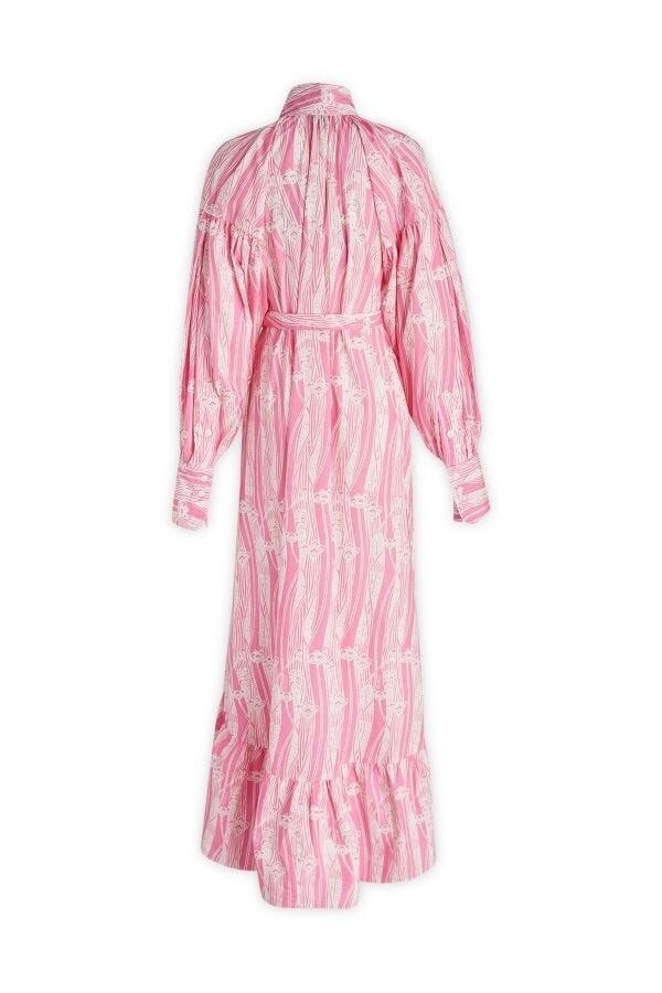 全体にプリントされたグラフィック モチーフが特徴のピュア コットン製ロング ドレスです。