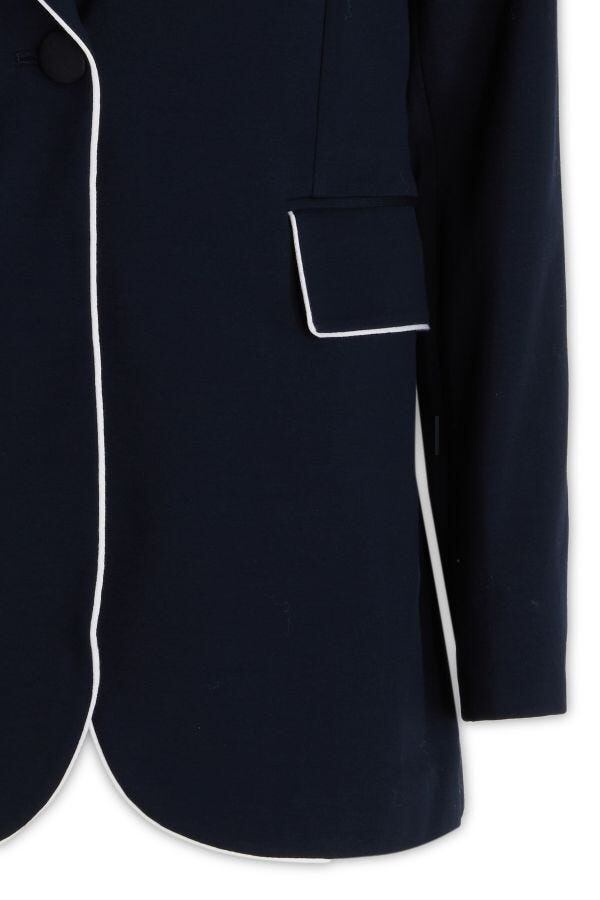 プロファイルに適用された印象的なパイピングが特徴の、ストレッチ コットン製のジャケットです。