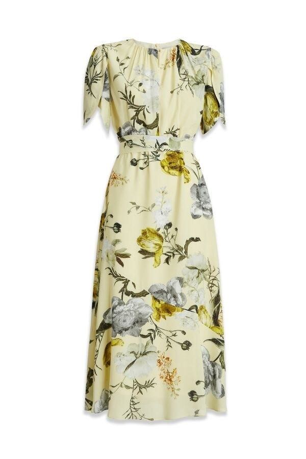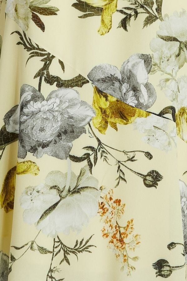 大胆な花が軽量のレモン クレープを飾り、今シーズンのブリーリー ブーケ プリントが特徴です。