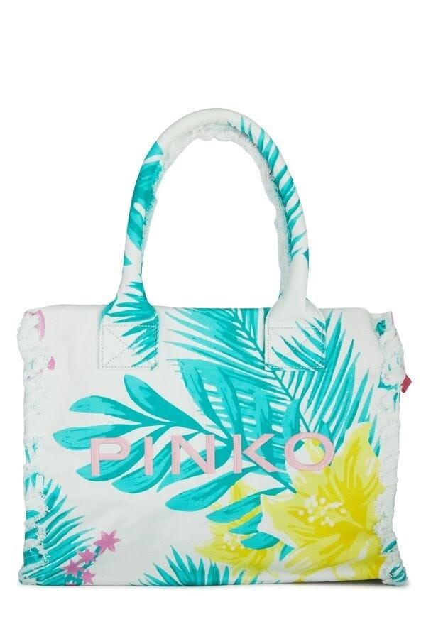 全体に花柄のモチーフが特徴的な、リサイクルコットンキャンバス製のバッグです。