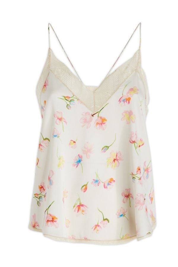 全面に施された花柄のモチーフが特徴的な布帛製のキャミソールです。