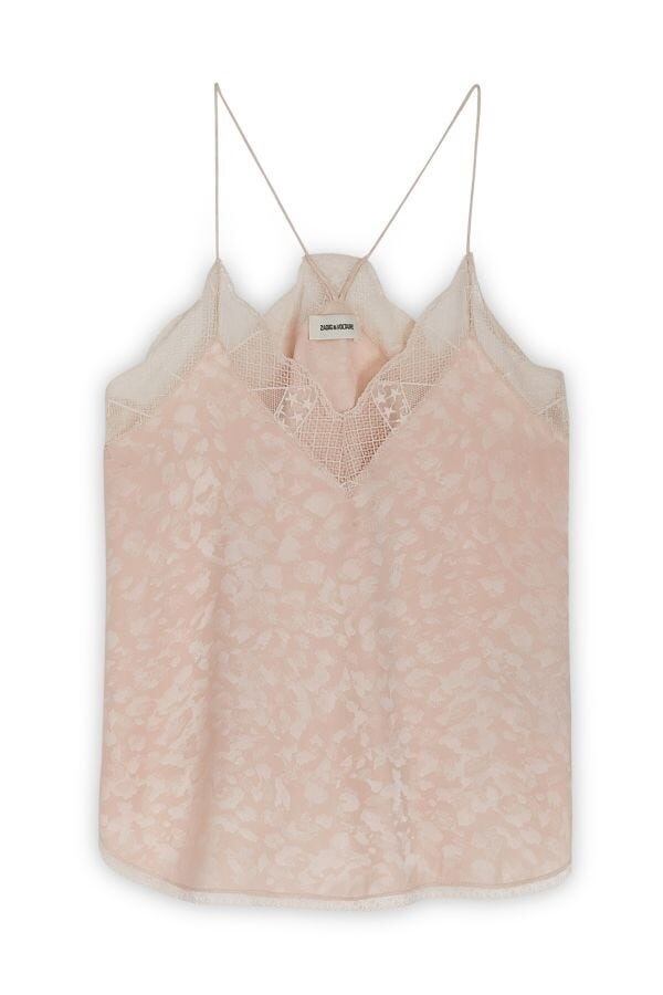 コントラストのある細いレースと全体に施されたヒョウジャカードが特徴の、シルク製のクリスティキャミソールです。