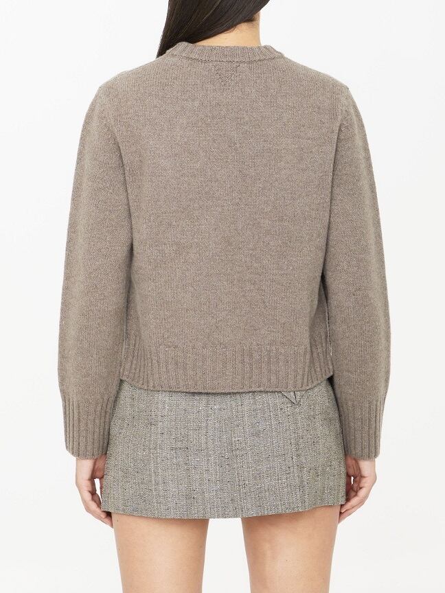 ゴールドトーンのメタルノットボタンが付いた、トープの厚手のウール製長袖クルーネックセーターです。