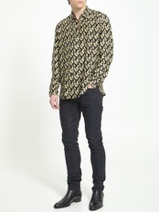全体にブラックとベージュのモチーフが施されたビスコース ボイル シャツです。