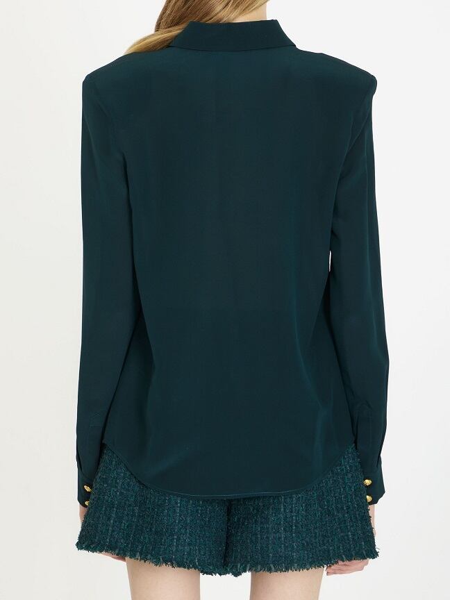 エンボス加工のゴールドトーンボタンが付いたグリーンのクレープデシン製長袖シャツです。