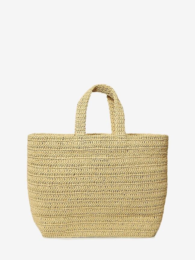 かぎ針編みモチーフとリヴ・ゴーシュ・サンローランの刺繍が前面に施された、ベージュのラフィア製のソフトなショッピングバッグです。