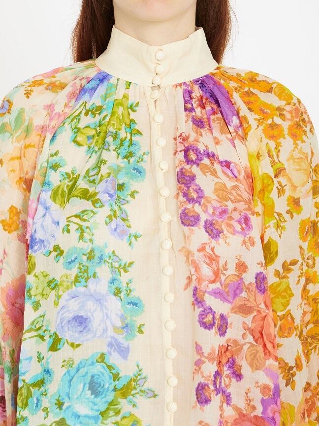 全体にマルチカラーのモチーフを施したラミー素材の Raie Billow ブラウスです。