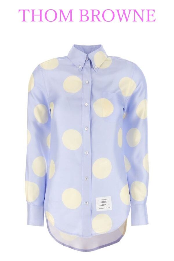 前面のコントラストのあるロゴ入りラベルと背面の象徴的なトリコロールラベルが豊かな表面全体の水玉模様のプリントが特徴のピュアシルクで作られたシャツです。