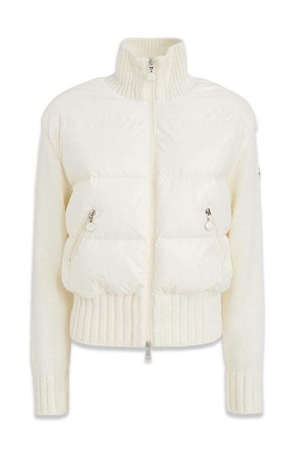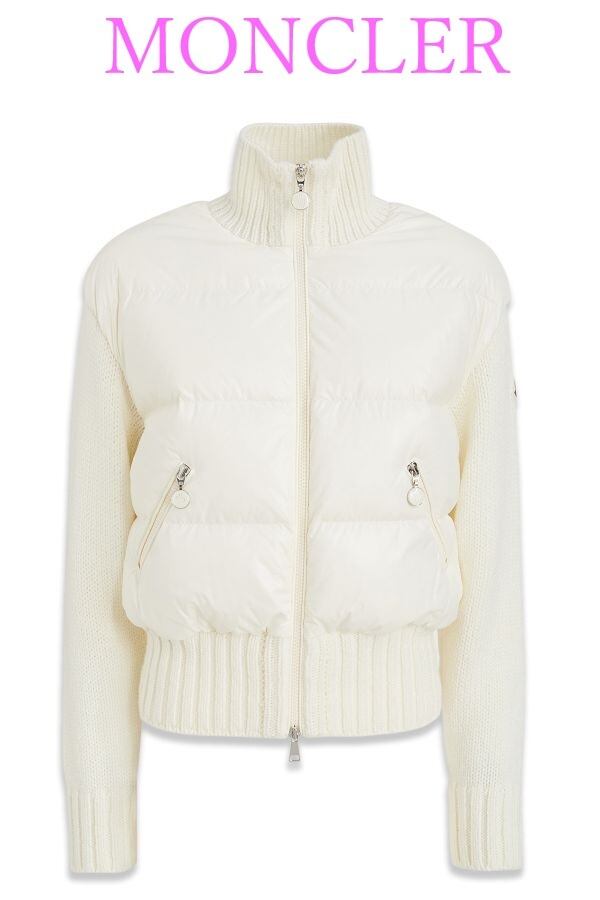 袖、襟、裾はウール ニット製で、背面のレタリング付き MONCLER ロゴがアクセントになっています。