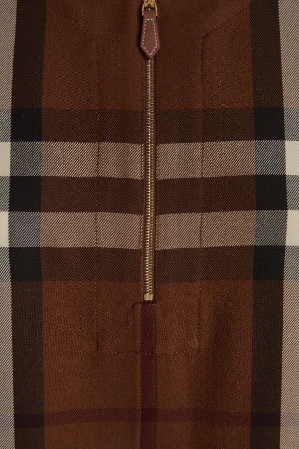 全体にエクスプローデッド チェック プリントが施され、ジッパー付きの前立てと光沢のあるトーマス バーバリー モノグラム リベットがアクセントになっています。