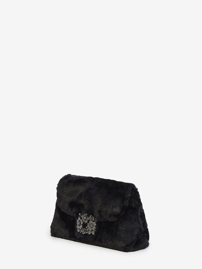 RV ブーケ ブーケ クリスタル バックルが付いたソフト ブラック エコファーのドレープ バッグ。