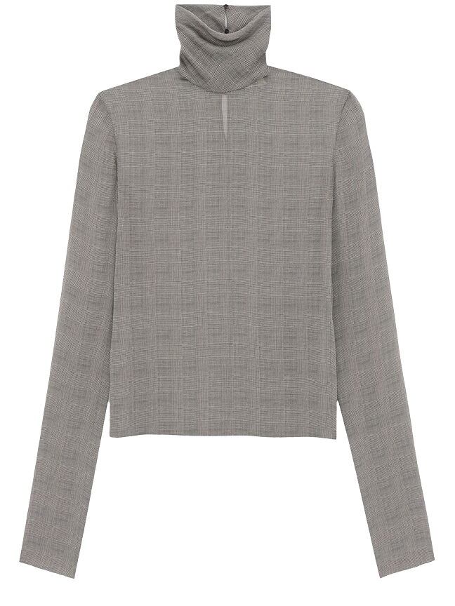 タータンチェック シルク クレープ素材の長袖ハイネック トップ。