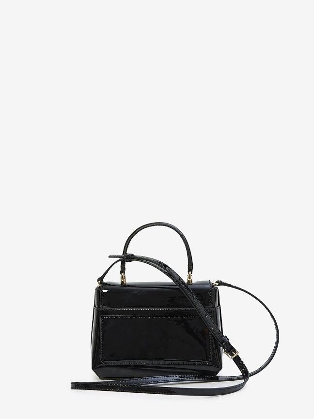 前面に同系色の DG ロゴがエンボス加工された、ブラックの光沢のあるカーフスキンのミニバッグ。