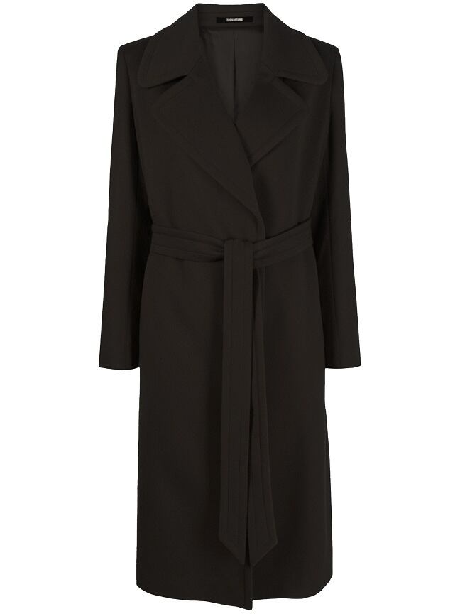ウエストに取り外し可能なベルトが付いたソフトなブラックのウールコート。
