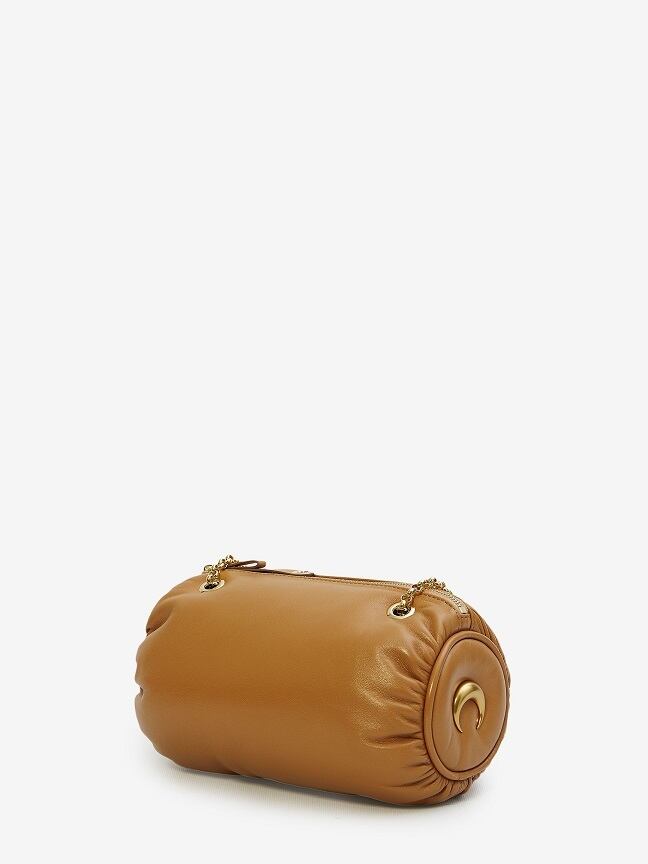 サイドにゴールドトーンのメタルの月のディテールが付いたソフトベージュのラムスキン製ピローバッグ バゲット。