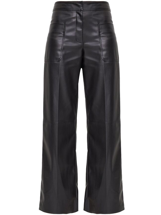 ブラックのエコレザーのハイウエストワイドレッグパンツ。