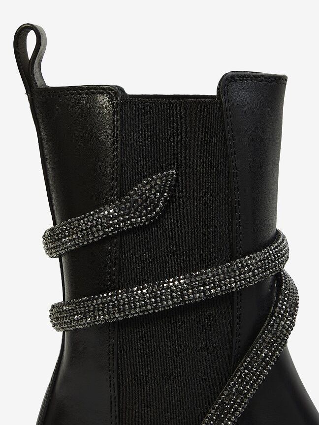 スネークのラインストーンが付いたブラック カーフスキンの Cleo Biker ブーツ。
