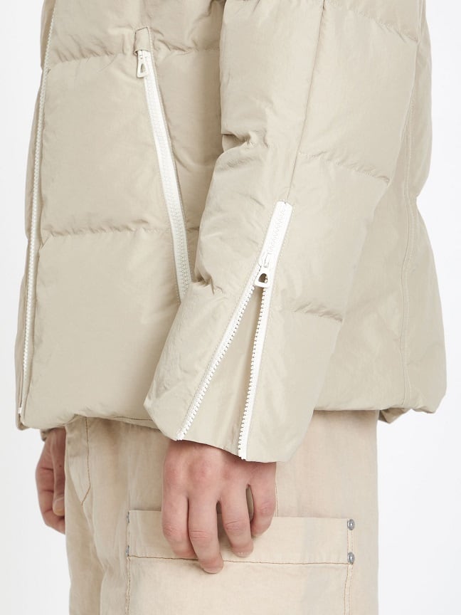 ベージュのパッド入りキルティングナイロン製のレトロなラグランダウンジャケット。
