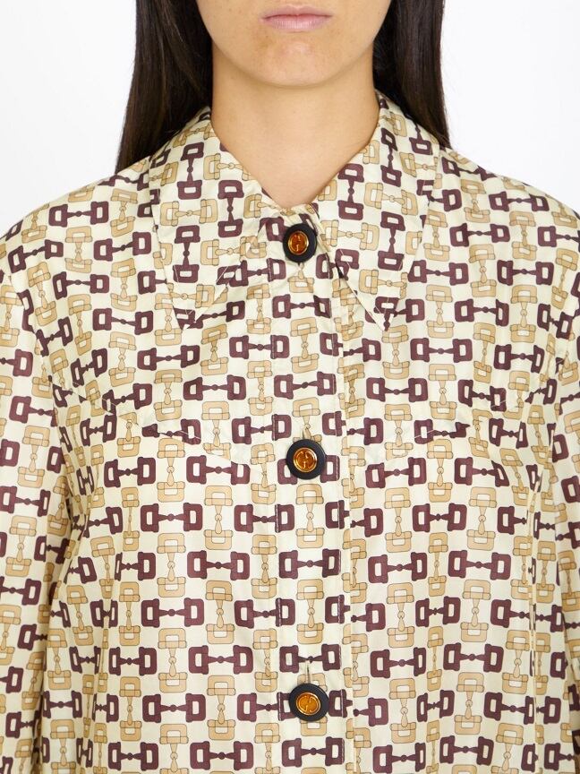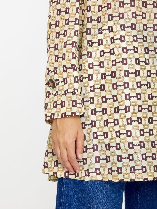 アイボリーとブラウンのホースビットプリントのナイロンコート。