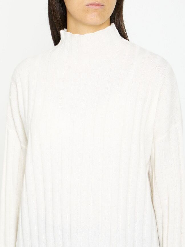クリーム色のリブ編みカシミア製、ハイネックの長袖 Inga ジャンパー。