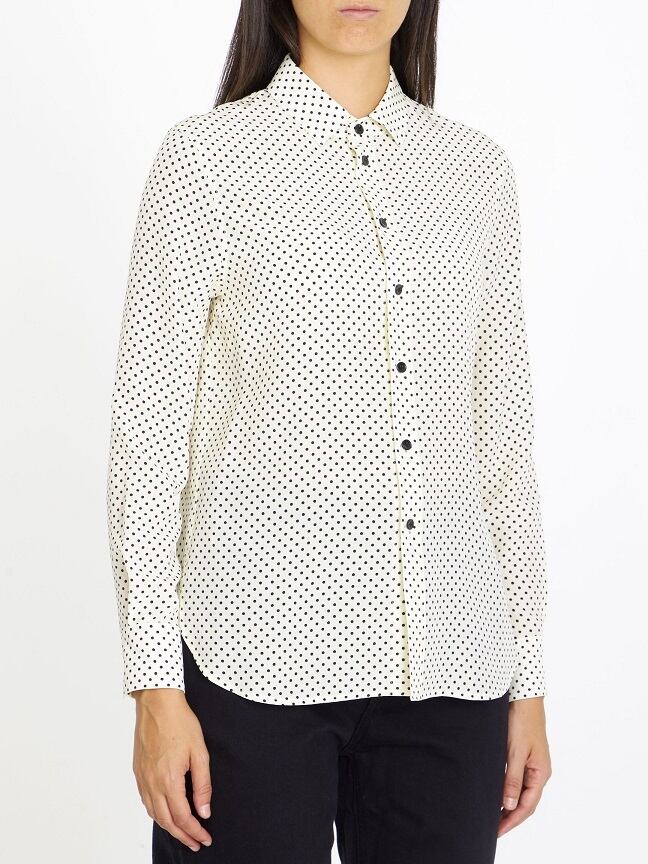 全体に水玉模様のモチーフが施された白いクレープデシンシャツ。