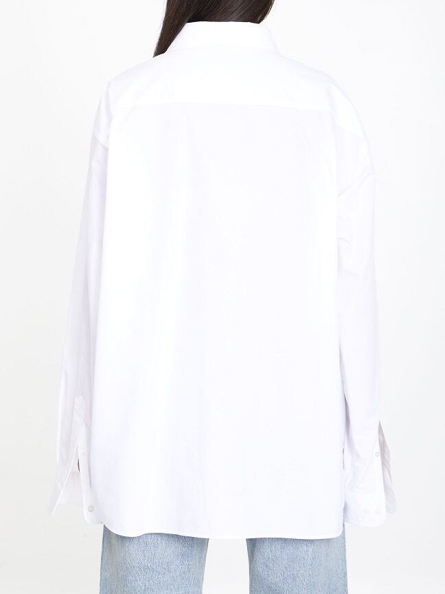 ドロップネックラインのバレンシアガ 襟にバレンシアガの刺繍が入ったホワイトのコットン ポプリン製オーバーサイズ シャツ。