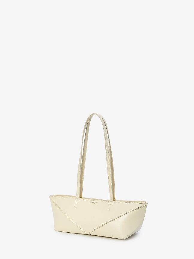 前面にロエベのロゴが刻印された、ホワイト カーフスキンのクロップド パズル フォールド バッグ。