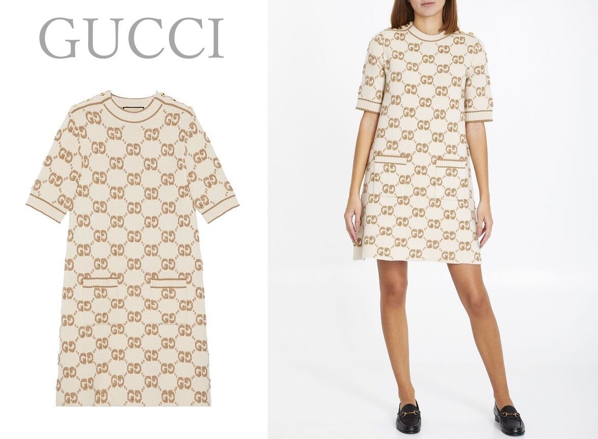 アイボリーとキャメルのGGウールブークレジャカード生地の半袖クルーネックドレス。