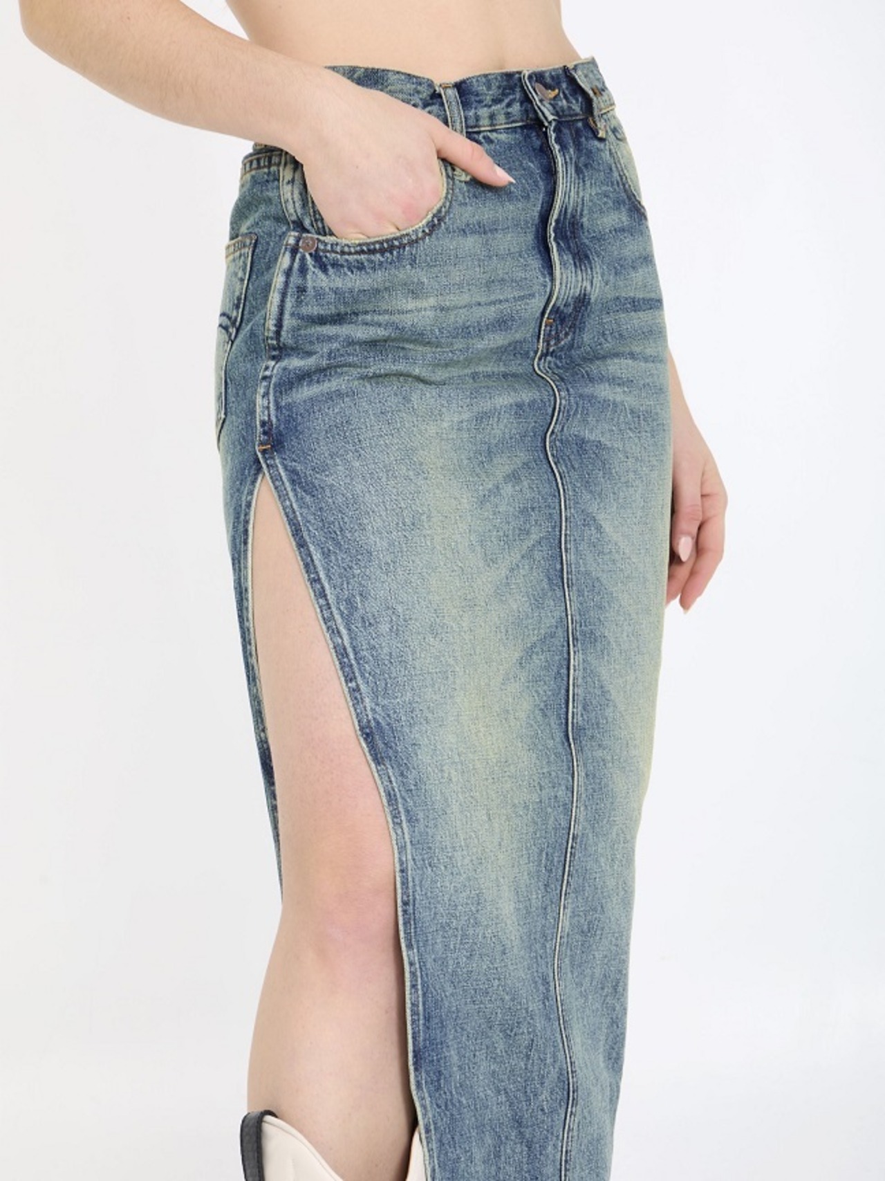 Devon ヴィンテージ効果のある日本製リジッドデニムのサイドスリットスカート。